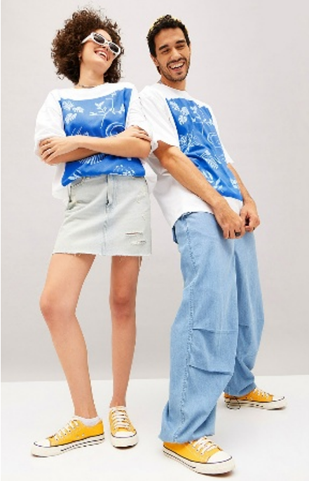 The image depicts a woman on the left, with curly hair and stylish white sunglasses perched atop her head, she wears a chic distressed light blue denim mini-skirt, her arms crossed in a relaxed pose. Beside her, a man with a warm smile wear a sports baggy in light blue denim pants. Both share matching white oversized t-shirts featuring striking blue botanical patterns, completed with bright yellow sneakers.